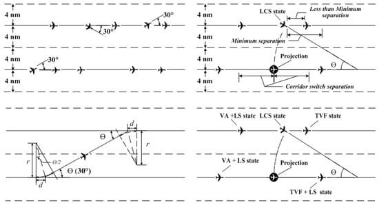 - Update self-separations states for each aircraft in flight queues in the flow corridor according to the self-separation states transition rules [16]. The main information used for determining self-separation states includes the basic operational performance states (position, velocity, acceleration, etc.), separation and velocity difference with lead flight, available space in the adjacent lane, previous self-separation states for relative flights.