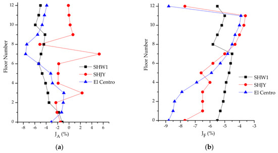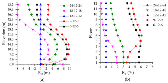 - For the middle structure, RD and RF changed significantly as the number of floors of structures on both sides changed. Except for the model 9-12-9, the peak floor displacements of the lower stories of the middle structure of the structure groups with different heights increased, compared to that of the model 12-12-12. However, the peak floor displacements of the higher stories decreased, compared to that of the model 12-12-12. The peak floor displacement of the middle structure of the higher stories was increased by up to 9.8%, while the peak floor displacement of the middle structure of the higher stories was reduced by up to 7.9%.