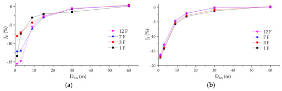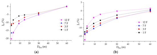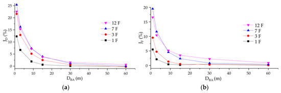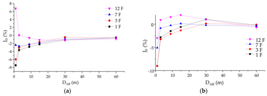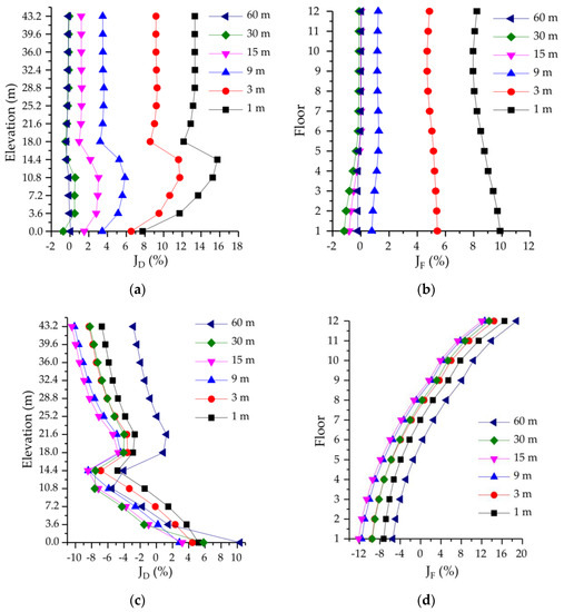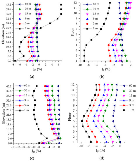 - In the four cases studied in this paper, when the clear distance between adjacent structures was small to a certain extent, the effects of SSSI were significant. However, the effects of SSSI diminished rapidly as the clear distance between adjacent structures increased. When the clear distance between adjacent structures was more than 15 m (0.5B, B refers to the width of the structure in the X-axis direction), JD and JF were both within 5%. When the clear distance between the structures was more than 30 m (1.0B), JD and JF were close to zero, and the effects of SSSI could be ignored. When the clear distance between structures was less than 9 m (0.3B), the effects of SSSI were significant.