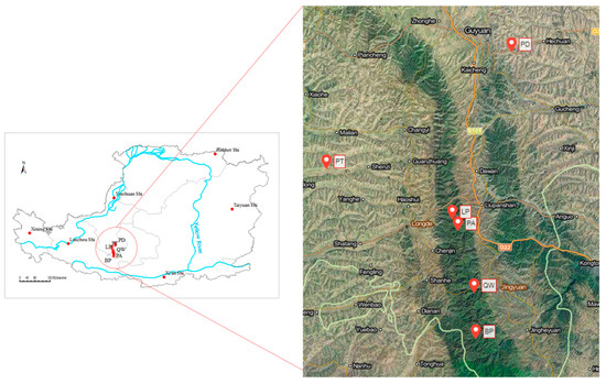 Geographical location of the study region and sampling sites. BP is short for Betula platyphylla, PA for Pinus armandii, LP for Larix principis-rupprechtii, QW for Quercus wutaishanica, PT for Pinus tabulaeformis, PD for Populus davidiana, respectively (the same as below).
