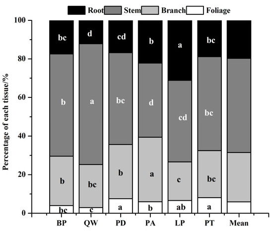 Biomass partitioning of each tissue among six species (Figure 2) showed that tree biomass mainly accumulated in the stem. Except for Larix principis-rupprechtii, the percentage of each tissue for other tree species ranked the order of stem > branch > root > foliage (Figure 2). For example, the percentage of stem biomass to total biomass ranged from 38.41% (Pinus armandii) to 62.61% (Quercus wutaishanica), while the percentage of branch ranged from 19.97% (Larix principis-rupprechtii) to 33.41% (Pinus armandii). Root also constituted a large percentage of total tree biomass, varying from 12.15% to 31.13%. Regarding segregation of foliage, the percentages of all the six species were less than 10%, with Quercus wutaishanica having the least proportion.