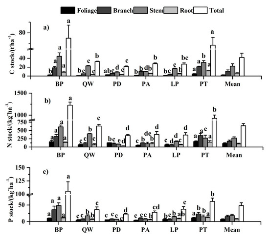 Nutrient stocks of each tissue among six tree species. Different letters in a line mean significant difference among tree species at p = 0.05. Error bars are the standard error of the mean. (a), (b), and (c) were C stock, N stock, and P stock of each tissue among six tree species, respectively.
