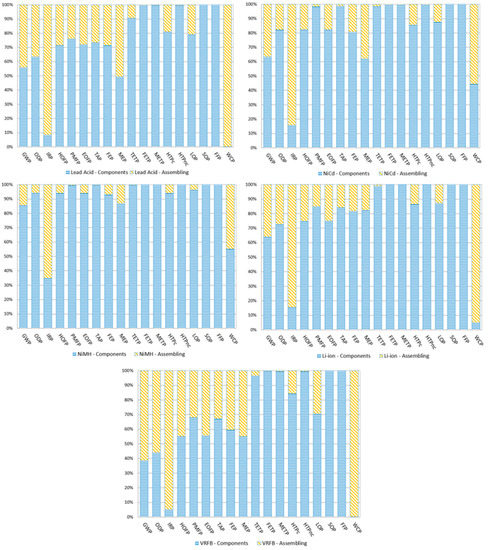 Under the cradle-to-gate perspective, Figure 2 shows the environmental impact distribution in terms of percentage for each battery. As expected, the component production stage had a greater environmental impact compared with the assembly stage in most impact categories, as also found in previous studies of batteries [45].