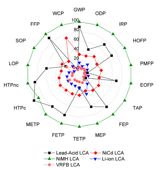 Although the assembly stage can also be an area of concern for developing effective actions to reduce the environmental impact of batteries, based on the LCA results, it was excluded from the batteries’ comparison. Under this perspective, the comparison of the 18 impact categories by excluding the assembly stage is shown in Figure 3.