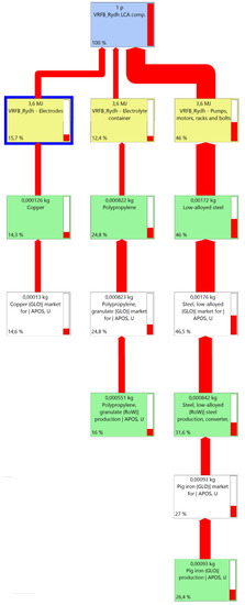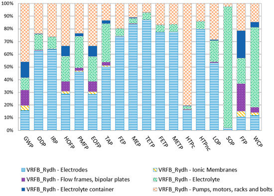 As mentioned in Section 3.2, the component production stage is mainly responsible for the environmental impact of batteries. In the case of the VRFB, the electrodes; the electrolyte; and the set of pumps, motors, racks, and bolts, in that order, were identified as the key components mentioned owing to their environmental impacts (Section 3.3.1).