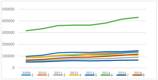 The total turnover of the first companies from the eight developed regions. Source: Authors’ processing from the Romanian Annual Statistical Yearbook 2010–2017 [76].