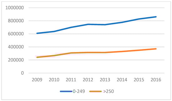 The turnover of SMEs (0–249 employees) and of big enterprises. Source: Authors’ processing from the Romanian Annual Statistical Yearbook 2010–2017 [76].