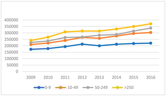 By analyzing the turnover of enterprises of different sizes, as conveyed in Table 4, even if all of them experienced the same upward trajectory, Figure 3 reveals that the big enterprises have a greater value for this indicator. Nevertheless, all of these cumulated data indicate that SMEs may greatly exceed this value (Figure 2).
