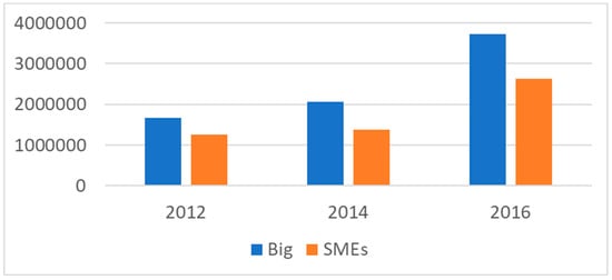 The value of expenditures on the innovation of SMEs and big enterprises. Source: Authors’ processing from the Romanian Annual Statistical Yearbook 2010–2017 [76].