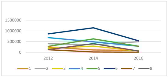 Total expenditures on innovation for the enterprises in the eight regions of development. Source: Authors’ processing from the Romanian Annual Statistical Yearbook 2010–2017 [76].