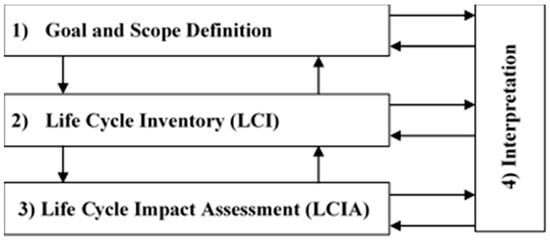 The LCA is an approach for identifying and assessing the environmental impacts of products, services, or processes throughout their entire life cycles, namely extracting raw materials, processing and manufacturing, operation, and end-of-life (EOL) [14,15,16,17,18]. The first sets of LCA standards were established during 1997–2000 by the International Organization for Standardization (ISO), leading to the ISO standards 14040, 14041, 14042, and 14043 [19]. In 2006, the updates to these standards were finalized in which the previous versions were amalgamated into ISO 14040 and 14044 [20,21]. The major feature of an ISO standard is a four-step iterative framework, including a goal and scope definition, inventory analysis, life-cycle impact assessment (LCIA), and interpretation (Figure 1).