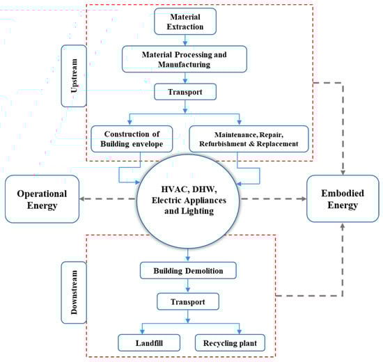 The LCEA focuses on the evaluation of energy inputs for different phases of the life cycle [9]. Figure 2 demonstrates the system boundary for performing a whole LCEA study, consisting of raw material extraction, material processing and manufacturing, transportation of materials to the construction site, the process of construction, installation, and erection, building operations and its maintenance, and demolition. The life cycle energy of buildings can be sub-divided into embodied and operational energy.