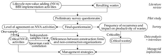 In this study, to evaluate the critical NVA activities’ impact on productivity, a total of 13 wastes resulted from these activities were identified from 19 previous studies in the literature review (see Table 1). For instance, Nikakhtar et al. [28] categorized noticeable wastes (such as overproduction, unnecessary inventory, transporting, and waiting time) hidden in construction processes due to the nature of operations and NVA work, and studied how they could be reduced by adopting lean thinking. Saieg et al. [41] found that synergies between BIM and lean thinking for reducing the wastes and fostering sustainability were mainly in the conceptual design phase and the construction phase. However, none of these previous studies explored the wastes derived from the lifecycle NVA BIM implementation activities in the Singapore context. Thus, this study contributes to the literature related to waste reduction and BIM implementation.