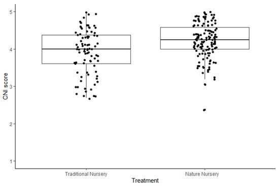 Results, as expressed in Figure 1, indicate that there is a difference between the nature connection of young children who attend nature nurseries when compared to those who attend traditional settings. This is supportive of H1, as well as previous qualitative literature [27,29], and the small quantitative study by McCree et al. [41]. However this study extends our prior knowledge in several ways, as the aforementioned studies focused on older children, and were either qualitative in nature or had very small sample sizes. This study found no correlation between age and CNI-PPC score.
