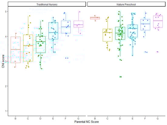 The saturated statistical model was checked for collinearity through variance inflation factor (VIF) values which ranged from 1.00 through to 1.17, with a mean of 1.08 indicating that collinearity was likely not an issue. All minimal adequate models were assessed for violations of GLM assumptions through residuals vs. predicted values; normality of errors and leverage model plots. Results of simplification of the GLM for the overall CNI-PPC score yielded a minimal adequate model with the school type (β = 0.42, p = 2 × 10−16) and parental nature connection score from B–G as predictors of CNI-PPC score with a medium effect (McFadden’s R2 = 0.13) (see Table 5). Children attending nature nurseries tended to have a higher CNI-PPC score than traditional nurseries (see Figure 1), and there was a general trend of increasing CNI-PPC score as the parental nature connection score increased from B–G (see Figure 2).