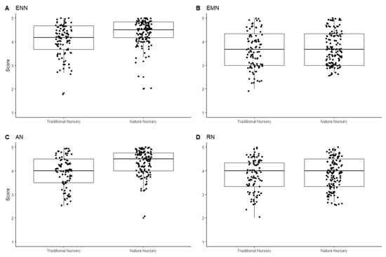 The CNI-PPC has four separate dimensions, each of which was looked at separately against all the variables, as well as the two settings (see Figure 3). In all four dimensions children who attended nature nurseries scored more highly than the control group, though the difference was only significant in the case of ENN and AN. Interestingly, females of both settings showed higher empathy and responsibility towards nature. Previous literature in children and adults has found that females do tend to have a higher nature connection score overall [39], though, interestingly, this was not found in this study for the overall score. However, our findings relating to empathy could be an actual representation of females’ increased empathy and responsibility, or a reflection of gender bias on the part of the reporting parent. Such gender bias has been reported in the literature before [48].