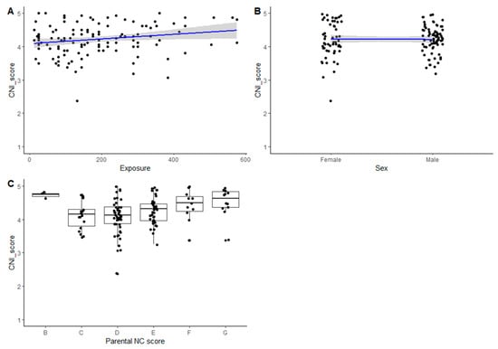 Nature nursery subset. (A) CNI-PPC score against exposure (approximation of days attended); (B) CNI-PPC score against sex of child; (C) CNI-PPC against parental nature connection score (line of best fit given by coefficients of generalised linear model (GLM), with shaded component indicating the standard error of the fit).