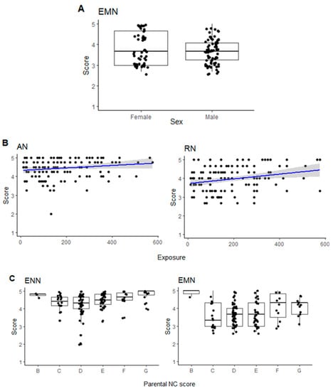 Relationship of CNI dimensions against predictors within nature nurseries (A) Empathy for nature (EMN) sub-score against sex of child; (B) awareness of nature (AN) and responsibility towards nature (RN) sub-score against exposure to nature nurseries; (C) enjoyment of nature (ENN) and EMN against parental nature connection score. (Lines of best fit given by coefficients of GLM, with shaded component indicating the standard error of the fit).