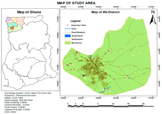 The study was applied to the Wa District that falls within latitudes 9°32′ N to 10°20′ N and longitudes 1°40′ W to 2°45′ W [44], as shown in Figure 1. It covers an area of approximately 1078 km2, representing about 19.74% of the region [45]. In pursuant of the decentralization policy, Wa Municipal was carved of the Wa District in 2004. However, the new municipal status was attained due to the increase in population, thus the study focuses on the Wa District status instead of the municipal. The climate of Wa is made up of long dry season and short raining season. The dry season records temperatures between 40–45 °C and annual mean temperature of about 27–28 °C. The total annual rainfall ranges from 910 to 2000 mm with an annual mean rainfall of 1027 mm and an annual average relative humidity of 59.3% [44,46]. The dry season is normally from November to April while the remaining months experience the raining season with its peak in August and October.