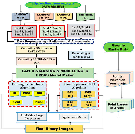 The stacked TOA images were used in the model maker to create the proposed index. The accuracy for index was conducted using digitized Google Earth data, which gives a real-time historical imagery of spatial features. The use of point samples as training data or validation data is only very effective if the points were/are picked for the respective year for which the classification is being done. The model maker facility in ERDAS enables the representation, in a simplified form, aspects of the computational mathematics and provides real-time feedback of the index manipulation results. The main advantage here is the capacity and ability to create self-contained functions that can be used later. The development of the proposed ISEI, as indicated in Equation (6), is based on mathematical consideration and manipulations of five bands. Three different Landsat sensors and a Sentinel sensor were used to test the new index. Processed images were subjected to five established impervious surface (built-up, considering man-made structures) extraction indices whose accuracies were used as a comparison case for the new index. The proposed new index is aimed at its suitability to be applied to four sensors thus it is developed based on the six common bands of the four Landsat sensors using band math algebra manipulations of the bands. For robustness and effectiveness, it has been tried with different sensors. This same explanation has been adduced by [36]. Also, these images stretch between 1984–2018, thus testing the atmospheric and climatic influence on the quality of images obtained.