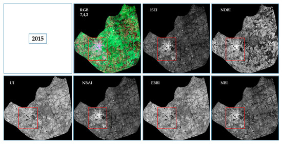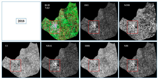 In this section, we give a brief background of comparable existing ISA indices, whose results will be compared with the proposed method in the subsequent sections. Indices are a form of an algorithm that combine different spectral bands of an image to highlight a feature of interest in the data. Furthermore, these indices are place-specific, as different environmental factors influence the attained results. The five existing indices (Equations (1)–(5)) that will be compared to the proposed index are the Urban Index (UI), Normalized Difference Built-up Index (NDBI), Enhanced Bareness, Built-up Index (EBBI), Normalized Built-up Area Index (NBAI), and New Build-up Index NBI. These five indices are ideal in the comparison, mainly because they focus on analyzing the urban expansion or growth within a city. Every band in a multispectral satellite image is spectrally biased towards a specific feature within the environment or a group of features usually with similar spectral properties. Notwithstanding, spectral reflectance may represent the combination of several land class as mixed pixel or impure pixel [35]. These spectral properties are enhanced when two or more bands are mathematically manipulated. An extraction index is a ratio between the strongest or maximum reflectance band to the weakest or minimum reflectance band, for a specific feature or genre cluster of features. Indexes basically, combine bands to extract specific land cover. The performance of these indices depends greatly on the spectral response of these features as espoused by [36]. However, climate and topographical differences influence the performance of these indexes on urban features.