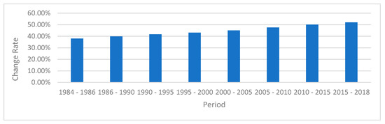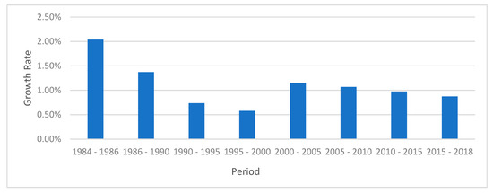 Although the country experienced some military era prior to 1992, the country had a stable environment for growth. This is clearly shown in Figure 13 for the periods 1984–1986 and 1986–1990. Newly created regions received the needed attention. The highest annual increase occurred for the period 1984–1986 up till 1990. In Table 4 it is observed that there is a slight decrease between 1990 and 2000. This was so because of the economic hardship that befell the country which necessitated some capital expenditure restrictions and support from International Monetary Fund (IMF). In an earlier study conducted this year by Oteng-Ababio et al., [58], it was realized that the municipal had a 66.3% concentration of urban settlers compared to 16.3% and 50.9% for the regional and national population, respectively. This is a slight reduction from the municipal figures of 2018 of 70.73% as displayed in Table 4.
