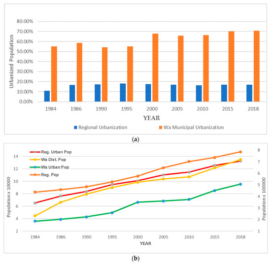 (a) Graph of urbanized population for region and district. (b) Graph of urban population for region and district. NB: Reg. Pop is on the secondary axis (right axis).