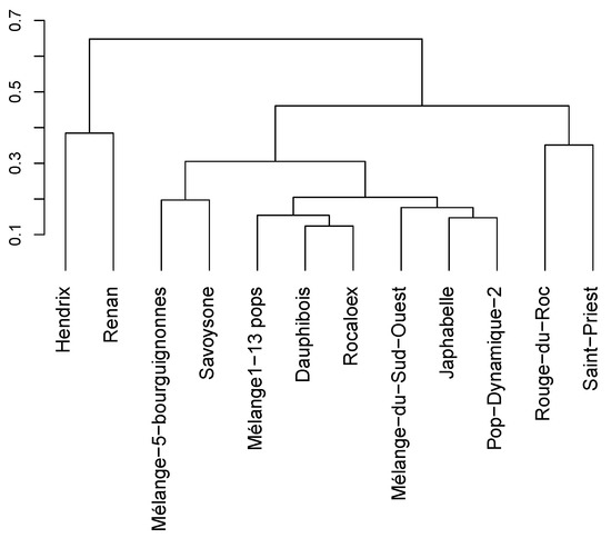 All the analysis were carried out using R software [48], and the genetic analysis using adegenet package [49]. Euclidian distances (Roger’s distance) between varieties were calculated and a clustering was done using the Ward method. Within-variety diversity was assessed by computing the expected () and observed () heterozygosity. The former was estimated as the Nei diversity index based on the allelic frequencies at each locus [50], and the latter was estimated as the proportion of heterozygous individuals at each locus averaged over all loci that were polymorphic within the studied variety.