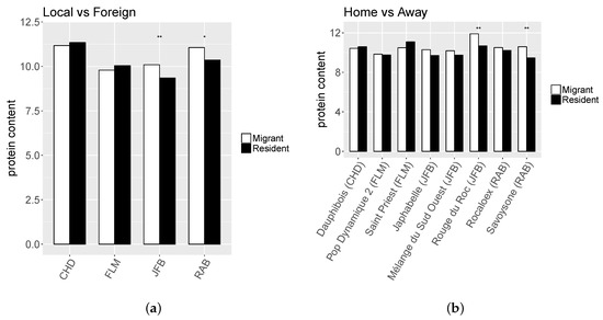 Least-square means for the interaction effects between “migrant vs resident” status and (a) farm (“Local vs Foreign”) or (b) population origin (“Home vs Away”, the farm of origin of each population is indicated in brackets) for protein content (PC).