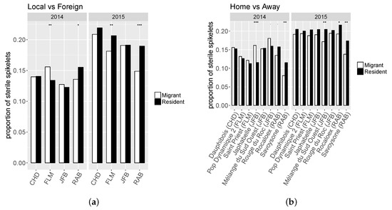 Least-square means for the interaction effects between “migrant vs resident” status and (a) farm (“Local vs Foreign”) or (b) population origin (“Home vs Away”, the farm of origin of each population is indicated in brackets) for the proportion of sterile kernels (NSPK_st).