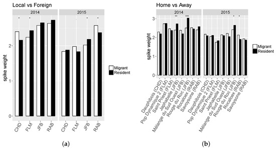 Least-square means for the interaction effects between “migrant vs resident” status and (a) farm (“Local vs Foreign”) or (b) population origin (“Home vs Away”, the farm of origin of each population is indicated in brackets) for spike weight (SW).