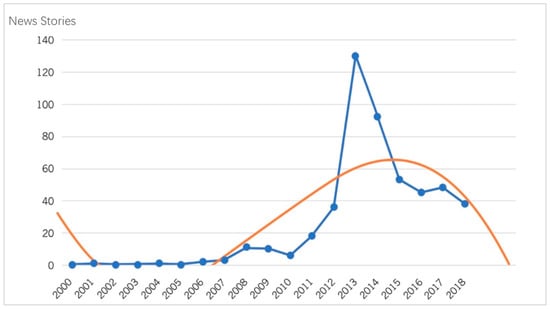 The amount of environmental coverage in Chinese newspapers has been growing [], evidenced by the most frequently mentioned sub-topics; air and water pollution. Earlier research has emphasized the media’s role in endorsing environmental actions []. For example, Xu (2012) focused on the coverage of air quality in Beijing and highlighted the increasing impact that media coverage in China has on environmental issues []. Previous research has also investigated the dissemination of haze-related news via digital and mobile platforms [,,].