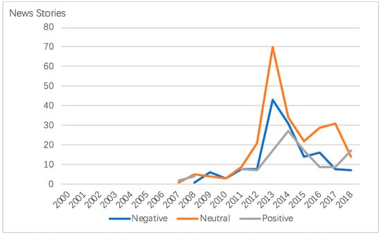 Finally, Kiousis (2004) found that the positive, neutral, and negative tones of political news coverage during the 2000 US presidential elections were an essential part of the media slant []. Entman (2007, 2010) also argues that there is a media slant in the news coverage on political conflicts. News slant appears when coverage of news emphasizes one side’s preferred frame and ignores or devalues the other side [,]. Lu et al. (2018) suggested that the US local media adopts a media slant strategy to degrade the image of China. Other researchers have also found that negative coverage of China affected the US elections []. Further research suggests that China’s mainstream media outlet, the Xinhua News Agency, tends to frame the Chinese government more positively []. Therefore, this article focuses on the emotional slant of the media (positive, neutral, and negative) and the second research hypothesis is: