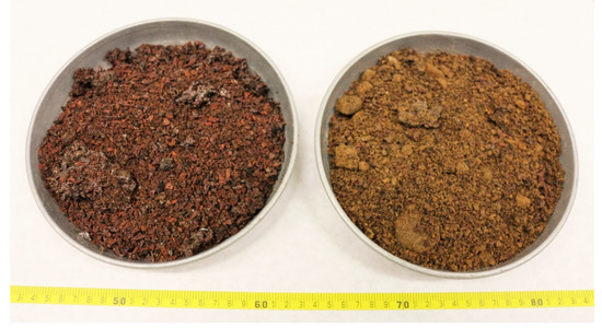 To determine the properties of sewage sludge bottom ash (SSA) the methodology used in building soils tests was adopted. Tests were carried out on SSA in the natural state and the mixture of SSA and sand composed in a volume ratio of 3:7. This value was recommended in the Technical Approval [35] for filling material by Polish Member of the European Organization for Technical Assessment (EOTA). SSA and mixture of SSA and sand are shown in Figure 2.
