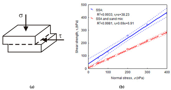 Shear strength of SSA or SSA and sand mix: (a) schematic diagram of direct shear apparatus, (b) shear strength test results.