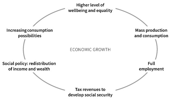 Figure 1 illustrates the key elements of the traditional idea of the virtuous circle and highlights the assumed interconnections between various policy goals and institutions. In the circle, GDP growth is the dynamo: it sets the circle in motion, causing favorable social development that then reflects positively back onto economic growth. Since the welfare state rests upon full employment and income generated in the market sector, the precondition for a welfare state and therefore the necessary policy goal is an increase in economic prosperity [30]. GDP growth requires and generates mass production and consumption, with a focus on exchange values rather than use values. This is reinforced by a wage-earning culture and full employment. The highest possible employment rate is an important policy goal because it also influences the demand for public spending and the amount of tax revenues. When households gain income they need through employment, investments, and rent seeking, the need for social benefits remains small, especially for benefits targeted to the working-age population (e.g., unemployment insurance and means-tested minimum incomes). Due to the improved tax revenues, the state can invest adequately in public services and social benefits. [35] Even though taxation on income and wealth reduces the gross income of certain households, its overall impact on consumption and growth remains positive. While the improved purchasing power of low-income households increases consumer demand, the economy—as measured by GDP—grows. Redistribution also reduces inequality [16]. The virtuous circle leads to greater wellbeing (in terms of higher standards of living) and a more equal society, which in turn benefits the economy through the stability and profits generated through production and consumption [30].