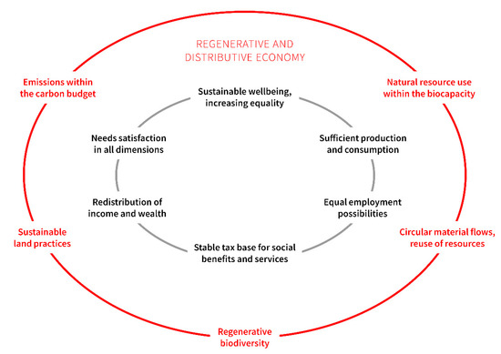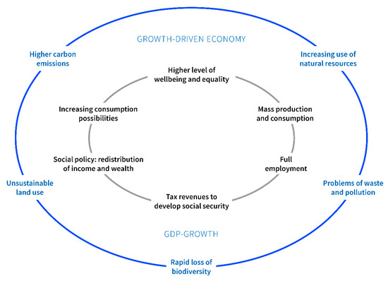 Second, the policy idea of the virtuous circle contains an unsustainable priority order between economic and social goals. As the historical analysis above shows, social goals including human wellbeing and equality became (at least implicitly) suppressed by GDP growth. What was supposed to be a means for wellbeing became an end in itself. Wellbeing seems to be “an interesting side-note” [23] (p. 7) that is largely separated from the natural environment. This view is challenged by research on social-ecological systems and ecological economics, where the economy is seen as a subsystem of society. The economy should be harnessed to enhance human wellbeing within planetary boundaries [8]. Accordingly, welfare institutions should be embedded in the ecological context, and economic policies should be subordinate to social goals.