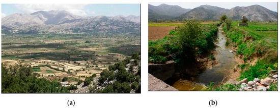 The Lassithi plateau: (a) a general view and (b) a drain (photos A. N. Angelakis).