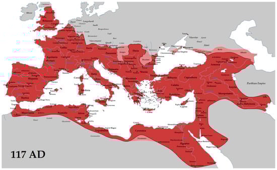 Romans exported to many regions their technical knowledge as well as their administrative rules, such as tax incentives, operations, and cadastral divisions linked to irrigation systems [105]. This spreading of knowledge was more prominent during the Roman Empire, which reached its largest expanse under Trajan (reigned 98–117 AD), encompassing an area of 5 million km2 with an estimated population of 55–60 million inhabitants, accounting for between one-sixth and one-fourth of the world’s total population. The territory of the Roman Empire in 117 AD is shown in Figure 8.