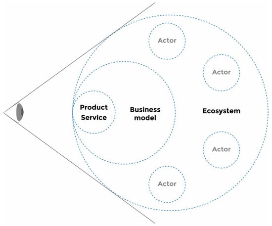 The existing literature on the circular economy has suggested that business model innovation may lead to higher circularity [,], because sustainable and circular business models take a broad perspective on a firm’s value creation. They look at the value a firm creates; for itself, as well as for a its stakeholders, including the environment [,]. However, a business model perspective usually focuses on how one firm does business []. An ecosystem perspective goes beyond this level, because it pays equal attention to the business models of other relevant actors. It looks at how a multitude of business models could be combined to achieve a collective outcome [,]. We therefore argue that a business model perspective is too narrow to achieve higher levels of circularity []. In addition to product/service and business model innovation, it is necessary to widen the innovation perspective to include the ‘ecosystem’ (Figure 1) [,].