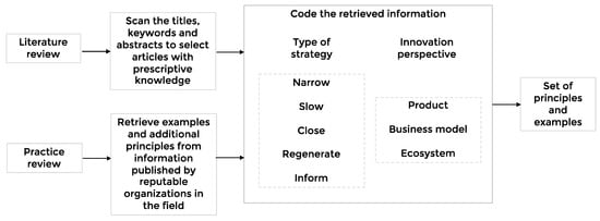 The practice review complemented the literature review. Often, practice information is ahead of the academic literature and may contain valuable insights for research [,]. We focused the practice review on identifying examples that match the principles. If an example did not match a principle, then we added the principle based on the example. The practice examples were retrieved from the internet (i.e., circular economy related websites, blogs, articles, websites) and the grey literature (e.g., practice reports on circular economy) to complement the results derived from the literature. We searched Google and used the strings [“circular economy” AND principles OR strategy*]. From the first three pages in Google, we selected a number of publications and case studies from reputable organizations and projects in the circular economy field. The publications and case studies we selected came from The Ellen Macarthur Foundation [,,,], IDEO Circular Design Guide [] and the ResCom project []. Figure 3 summarizes the process of the literature and practice review.
