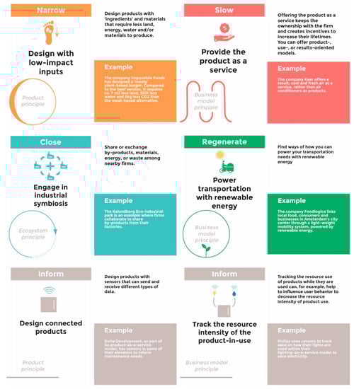 Narrowing refers to using fewer products, components, materials and energy during design and production [], and during delivery, use and recovery []. A product principle for narrowing is ‘design with low-impact inputs’ []. Impossible Foods, for instance, has designed a plant-based burger with a meat texture. Compared to the beef alternative, it requires ca. 7 m2 less land, 300 L less water and 5 kg less CO2 [,]. A business model principle for narrowing is, for instance, ‘incentivize users to consume less’. An example is HOMIE, a company that offers washing machines through a pay-per-wash model, monitors user behavior and provides advice and price incentives to wash with lower temperatures and the right amount of detergent. As a result, the firm’s users wash 30% less often and at lower average temperatures []. An ecosystem principle for narrowing is ‘maximize the use capacity of products’. This is sometimes referred to as ‘sharing’, where multiple user groups have access to the same product. This sharing can decrease the overall number of products in an ecosystem. The online platform Peerby, for example, enables people to share everyday goods like drills or bicycles, which can increase their usage and reduce the overall number of personally owned goods in homes over time. Maximized use capacity may require the coordination of multiple actors in a given ecosystem [,,].
