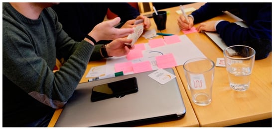 Retailers and local restaurants may increase their share of plant-based versus animal-based product offerings. This example applies a product principle for narrowing: ‘design with low-impact inputs’. They may start experimenting with systems for reusable packaging that is collected, cleaned and used again, which is an ecosystem principle for slowing: ‘turn disposables into a service ecosystem for reuse’. Food—especially fresh produce sold in the supermarkets and through the restaurant dishes—can be sourced, if appropriate, from peri-urban farm areas to reduce travel distances, which is a business model principle for narrowing: ‘localize supply where appropriate’. Transportation vehicles can be shared with fleet operators from other sectors (e.g., cars that can be used for last-mile food logistics, but also for taxi rides) to maximize their capacity utilization, which is an ecosystem principle for narrowing: ‘maximize capacity use’. Transportation vehicles can be easy to maintain and repair, which is a product principle for slowing: ‘design for ease of maintenance and repair’. Furthermore, the vehicles can be supported with product life-extension services like maintenance and repair, which applies a business model principle for slowing: ‘organize maintenance and repair services’. The transportation vehicles can be powered with renewable energy, applying a business model principle for regenerating: ‘power transportation with renewable energy’. The food left-overs from retail stores, restaurants and homes can be collected in local composting hubs that are then brought back to peri-urban areas to regenerate soil for further food production; an ecosystem principle for regenerating: ‘recover nutrients from urban areas’. Finally, the food retailers may collaborate with local farmers to create space for bees surrounding their farms to ensure the supply of valuable inputs that require pollination; an ecosystem principle: ‘manage and sustain ecosystem services’. The amount of food waste in restaurants can be tracked through Artificial Intelligence enabled image recognition technology to then train staff on how to reduce food waste in the kitchen; a business model principle for informing: ‘track the resource intensity of the product-in-use’. Online platforms can serve to market food that is about to be thrown away in restaurants; an ecosystem principle for informing: ‘market circular products, components and materials through online platforms’. Figure 6 presents a photograph of how the cards have been used in a workshop.