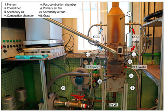 The experimental plant was designed as a refrigerated unit, having two separated cooling circuits to remove the produced heat (Figure 2b). The first circuit is used for cooling the bed named bed cooling circuit (BCC), and the other cooling circuit provides the refrigeration of the combustion and post-combustion chambers plus the FGR line named general cooling circuit (GCC). As previously mentioned, the main characteristic of the present plant is the refrigeration of the fuel bed. The planned experiments will focus on the study of its influence in the combustion reaction and emissions, aiming to establish the implications of introducing cold walls in that zone.