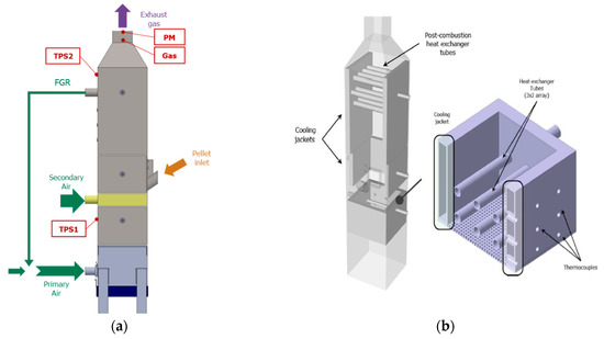 As depicted in Figure 2a, the combustion unit has separate inlets: on the one hand, the air that is needed for starting the combustion reaction and that primarily reacts with the potentially combustible species (basically C, H, S, N) named “primary air”. On the other hand, the air used in a later combustion phase is used for complete oxidation of the unburned species (named “secondary air”). Proper control of the air entering each combustion phase improves the process efficiency, reduces undesired emissions and deposition problems, and lengthens the lifespan of the combustion installation [10].