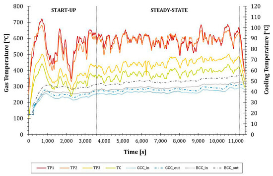Time evolution of temperature signals for a complete experiment. The left axis represents the gas temperatures along the plant from the post-combustion module (TP1, TP2, and TP3) to the chimney (TC). The right axis represents the cooling temperatures before and after the combustion for both water circuits: general (GCC in and out) and bed (BCC in and out).