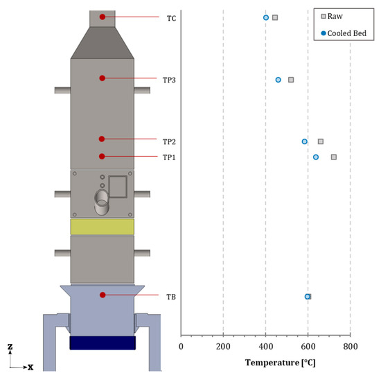 Gas temperature profile along the combustion unit for experiments with and without bed refrigeration (Cooled Bed and Raw, respectively). Temperatures were measured in the pellets (TB), in the post-combustion chamber (TP1, TP2, TP3) and in the chimney (TC).