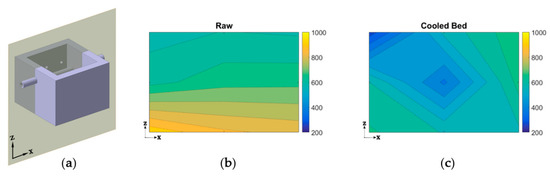 Temperature map of the central bed module section, plane ZX (a) for an experiment performed under raw (b) and cooled bed (c) conditions. Total airflow: 9 kg/h; air stratification: 50% primary-50% secondary; feeding cycle: 1 [s] ON–8 [s] OFF; temperatures are in °C.
