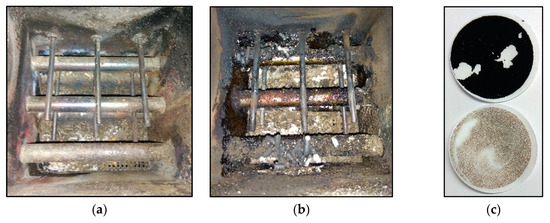 In addition, these changes in bed temperature resulted in strong differences in deposit formation and PM emissions. As shown in Figure 6a,b, when the BCC is activated, the reduction in bed temperatures enhances the condensation of certain compounds in its exchanger tubes. The sticky nature of these substances leads to the retention of more residual matter in the cold walls of the bed, resulting in the decrease in the released PM. In addition, according to the appearance of the sampled matter, the released PM is mainly inorganic for cooled bed experiments (Figure 6c). The preliminary results show a considerable decrease in PM released due to the effect of bed refrigeration, obtaining values up to 70%. This trend was also found by Petterson et al. [25], Jones et al. [26] and Alonso [27]. Therefore, it is expected that the fouling deposition tendencies in the heat exchangers are strongly affected by the presence of a cooled bed. This effect will be further investigated in future work as it is beyond the goals of the current paper.