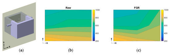 Temperature map of the central bed module section, plane ZX (a) for an experiment performed under raw (b) and flue gas recirculation-FGR (c) conditions. Total airflow: 9 kg/h; air stratification: 35% primary-15% FGR-50% secondary; feeding cycle: 1 [s] ON–7 [s] OFF; temperatures are in °C.